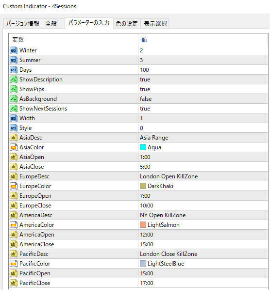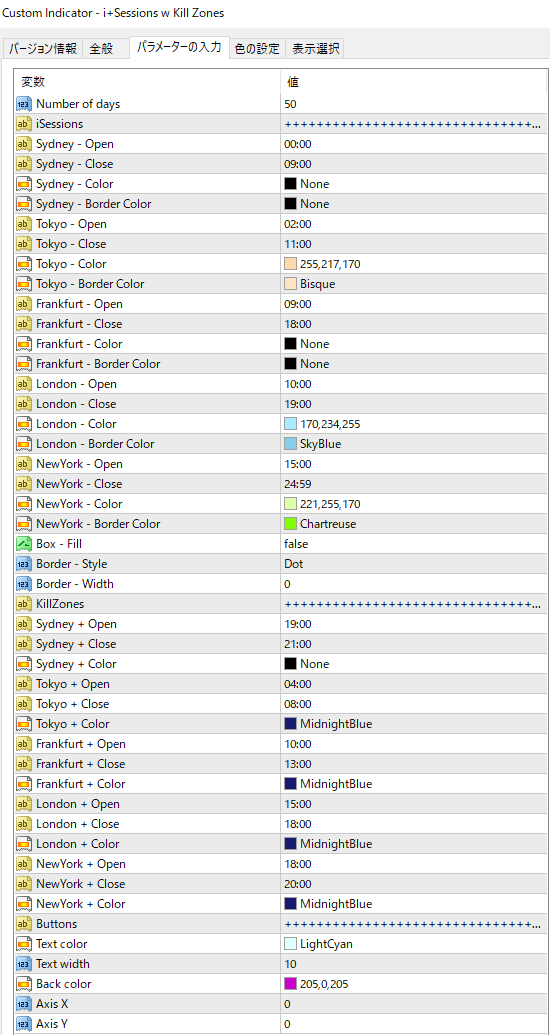 各セッションとキルゾーンの両方を表示し、それぞれについてボタンクリックで表示のオンオフが出来るインジです。