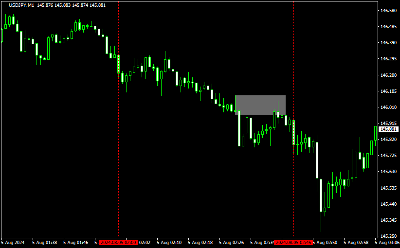 このピンクの価格帯を1分足で示したのが下のチャートです。(赤い点線内がピンクの時間帯)