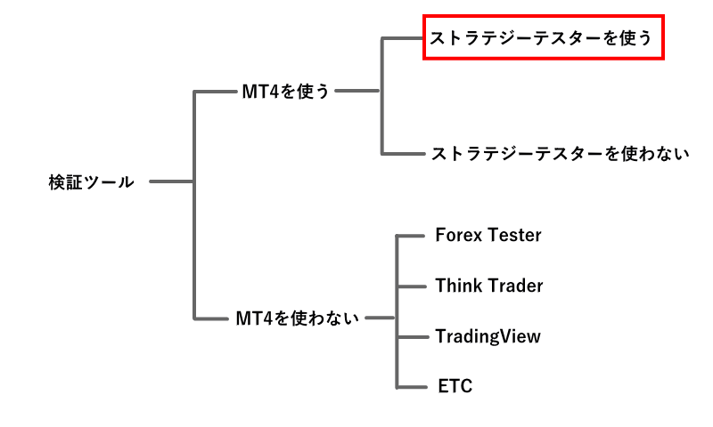 MT4を使う検証ツールは、更に「ストラテジーテスターを使うもの」と「ストラテジーテスターを使わないもの」の2つに分けられます。どちらとも検証用のEAを利用します。