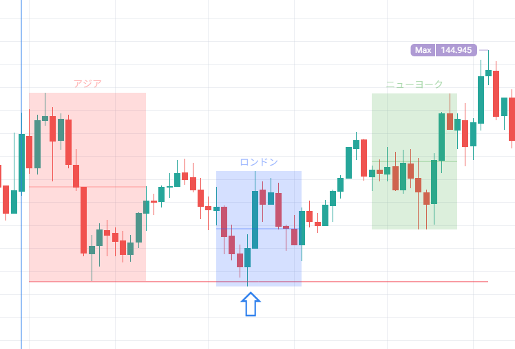 このチャートではアジアレンジとロンドンオープンの間の時間帯で、アジアレンジの安値をスイープしています。