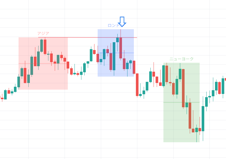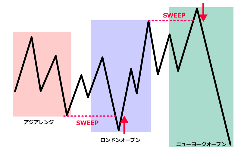 具体的にはアジアレンジキルゾーンの高値や安値をスイープした後やロンドンオープンキルゾーンの高値や安値をスイープした後の値動きを狙います。(スイープの定義については後述します)