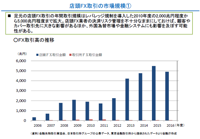 金融庁の提出した資料によるとFXの取引額は2015年度には5000兆円を突破しており、店頭FX業者の決済リスク管理を不十分にしておけば、顧客やカバー取引先だけでなく外国為替市場や金融システムに影響を及ぼす可能性がある・・・というのがレバレッジ規制が必要と考える理由のようです。
