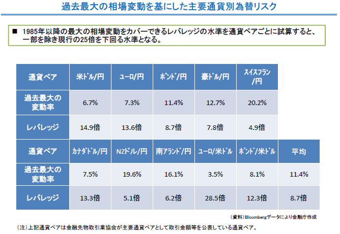 金融庁の資料では、1985年以降の各通貨ペアにおける最大の変動をカバー出来るだけのレバレッジ水準についても試算されています。