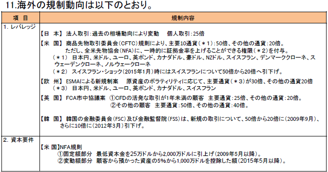 金融先物取引業協会からの資料に海外のレバレッジ規制についてまとめたものがありました。