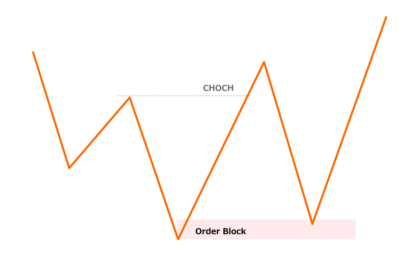 直近の高値をブレイクするも直ぐに勢いよく反発し、FVGを含む下落、そして直近の安値をブレイクするBOSやCHOCHといった条件を満たすことで、より信頼性のあるオーダーブロックとなります。