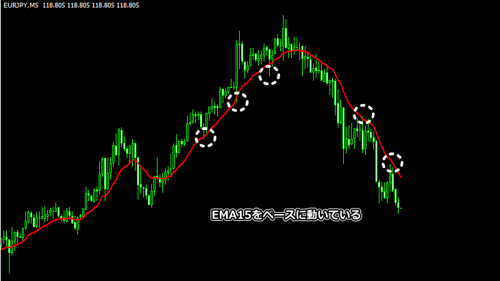 この日の5分足は、EMA15をベースに動いているのが分かります。
