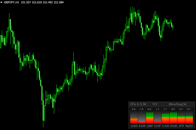 例えば日足などの上位足にMAを表示させて、それらの角度について複数の通貨ペアで見ていくことで、通貨の強弱を知ることができます。