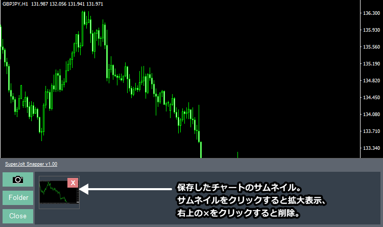保存先:MT4のMQL4と同じ階層内の「SuperJolt Snapper Screenshots」内に保存 ClickScreenShot1と同じく、ワンクリックで表示しているチャートを画像として保存します。 チャートの下の方にマウスカーソルを動かすとカメラのボタンが出現し、クリックするとその時のチャートを保存します。 画像を保存すると、サムネイルも表示されて、これまでにどんなチャートを保存したかもわかりますし、「Foleder」をクリックすると画像を保存しているフォルダに飛びます。 スタイリッシュで保存した画像の管理もできて便利です。 また、SuperJoltSnapperFilesはオフラインチャートでも画像が保存できます。