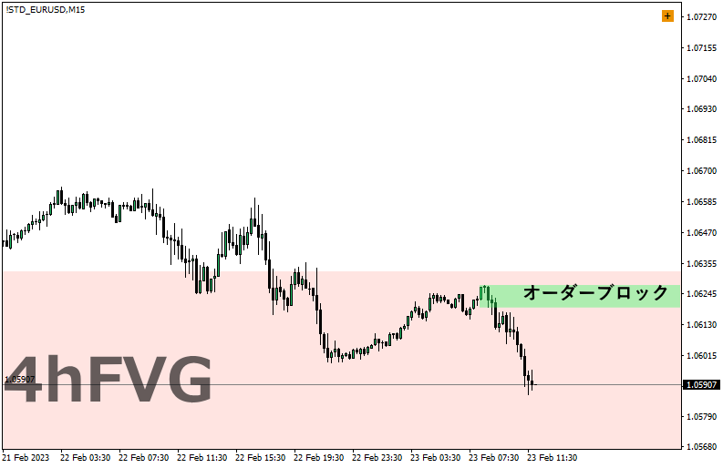 オーダーブロックの下は勢いよく下げており、4時間足FVGの中ですから、再度オーダーブロックまで戻して来たら、高確率で反転して下げると考えられます。