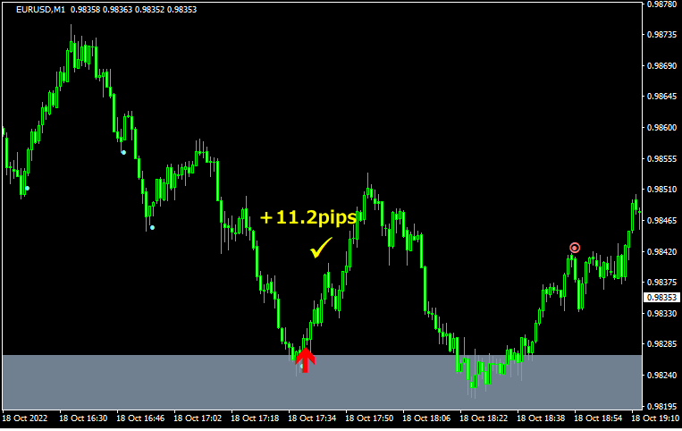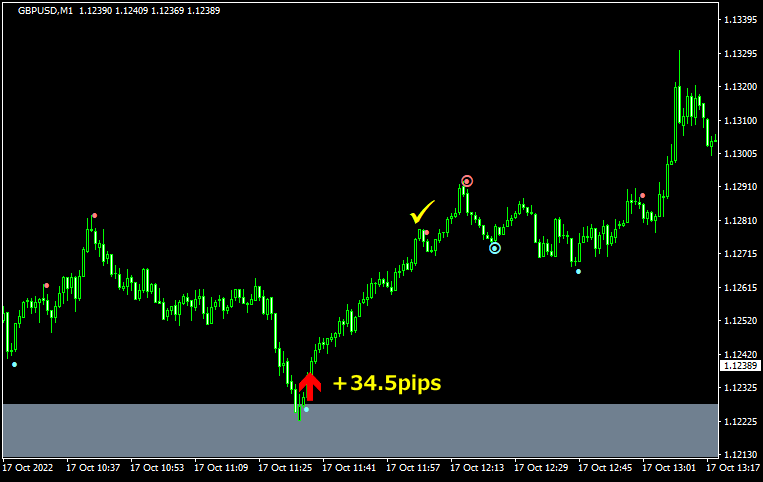 - オーダーブロックの価格帯まで戻したところで、1分足の方でドットが点灯したらエントリー