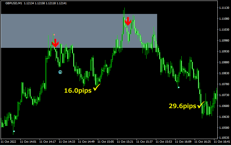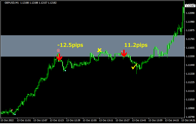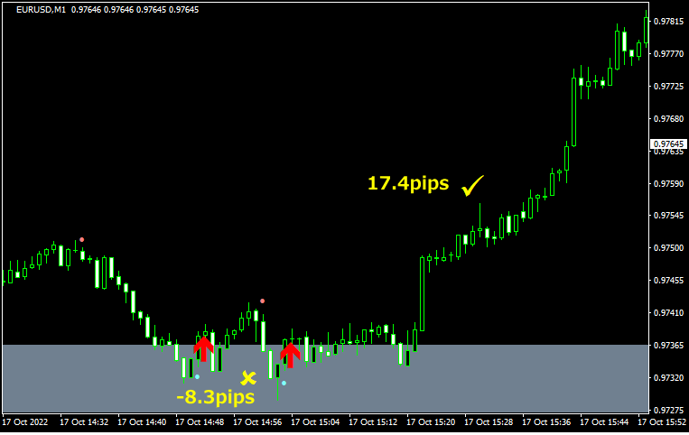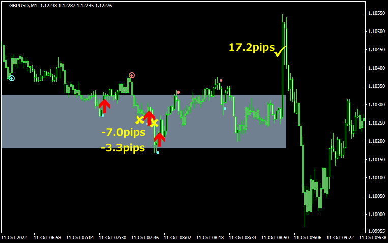 1分足を使ってエントリーする割にはチャンスは少なめではありますが、平均すれば1日に1回程度のチャンスがあります。