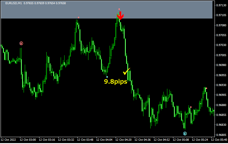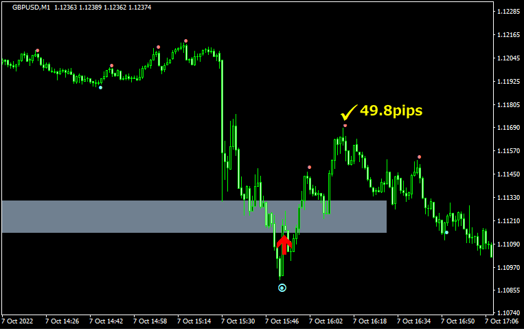 今回のルールでは、利食いや損切り後、再度オーダーブロックまで戻して、安値を更新した所でドットが点灯するのであれば、何度でもエントリーするようにしています。(ただし15分足のオーダーブロックを、15分足の終値でブレイクしたら終了)