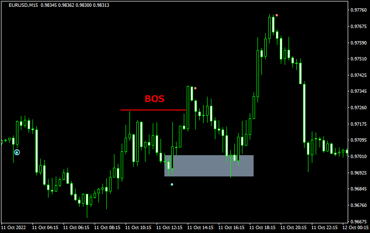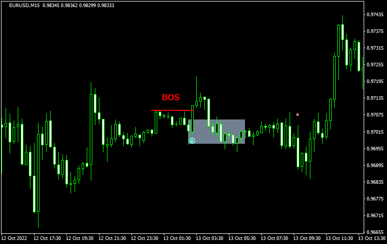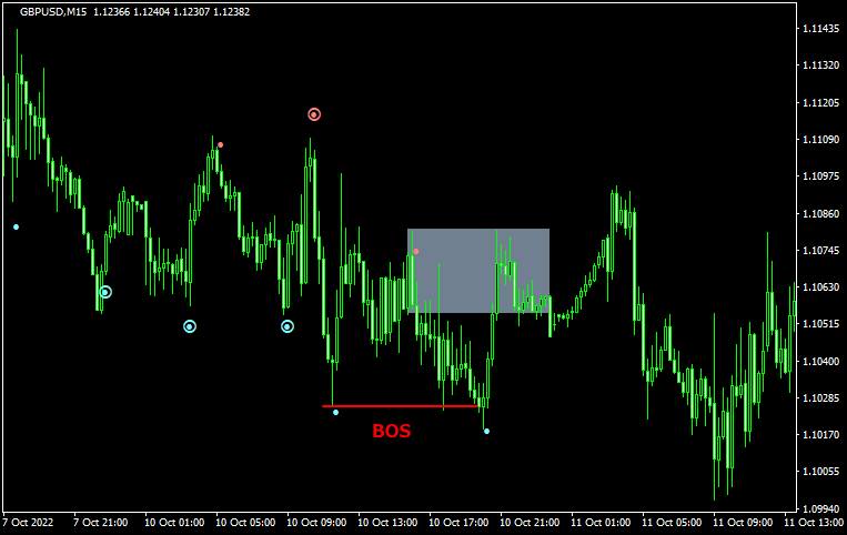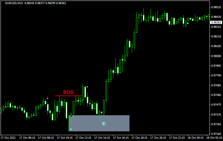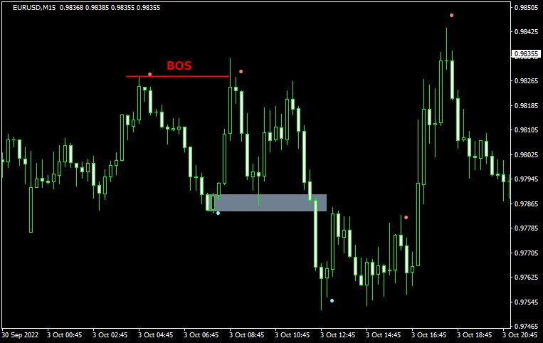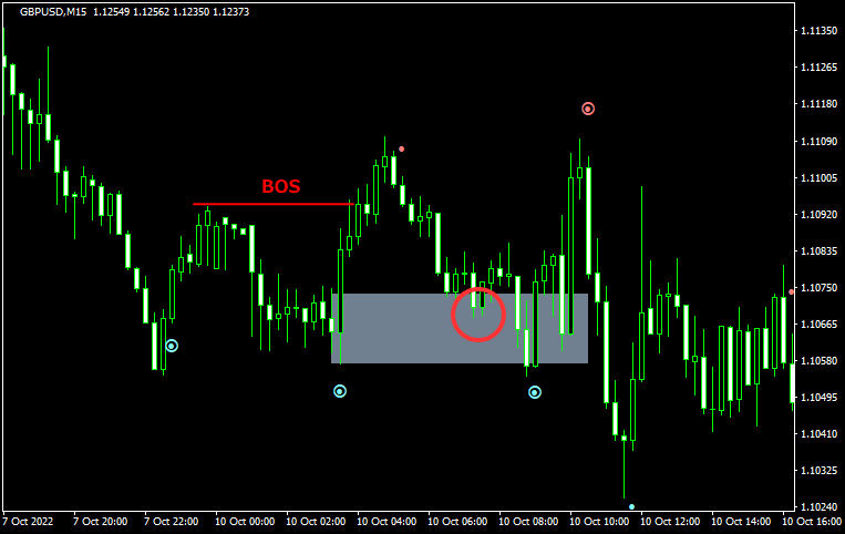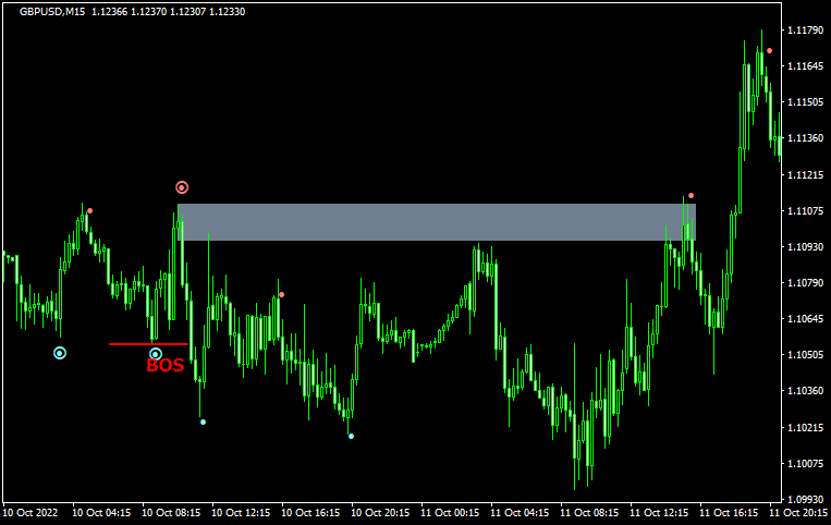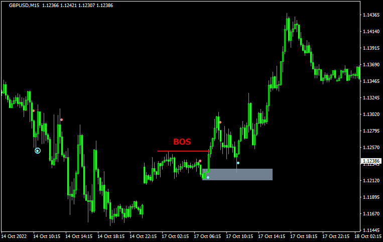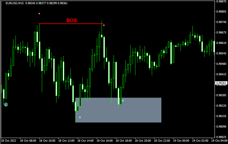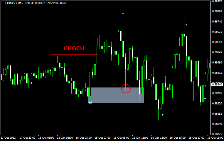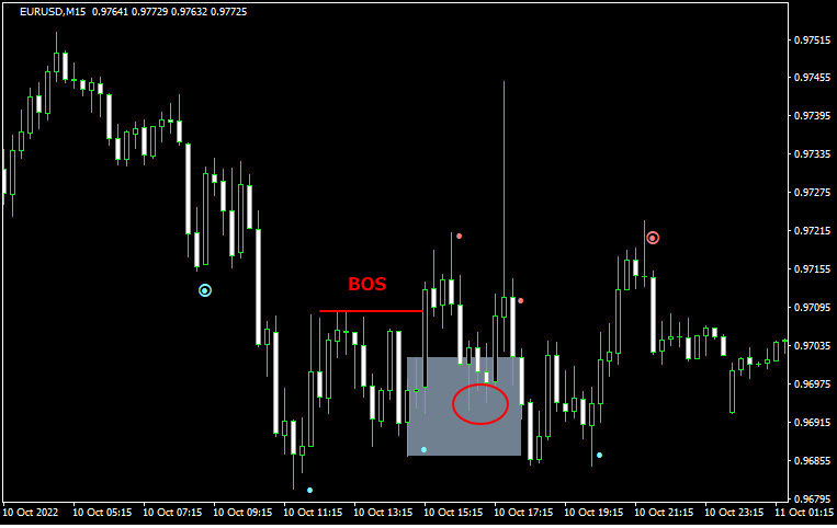 - ドット点灯後、15分足で直近の高値や安値をブレイクして、ドットの足の価格帯がオーダーブロックになる