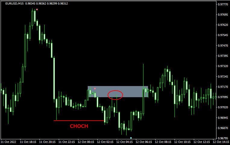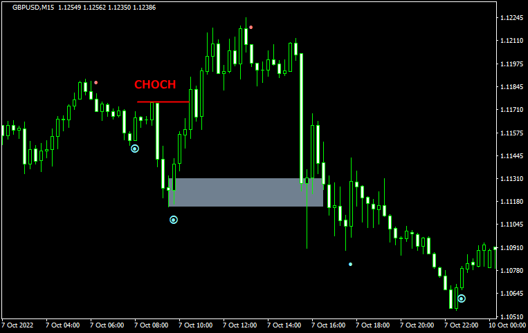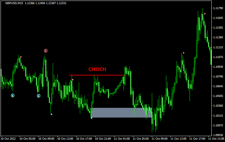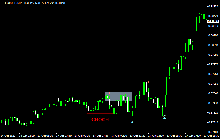 15分足でインジケーターのドットが点灯したら、直近の高値をブレイク(CHOCH)するのを待ちます。(ブレイクしなければエントリー条件を満たしません)