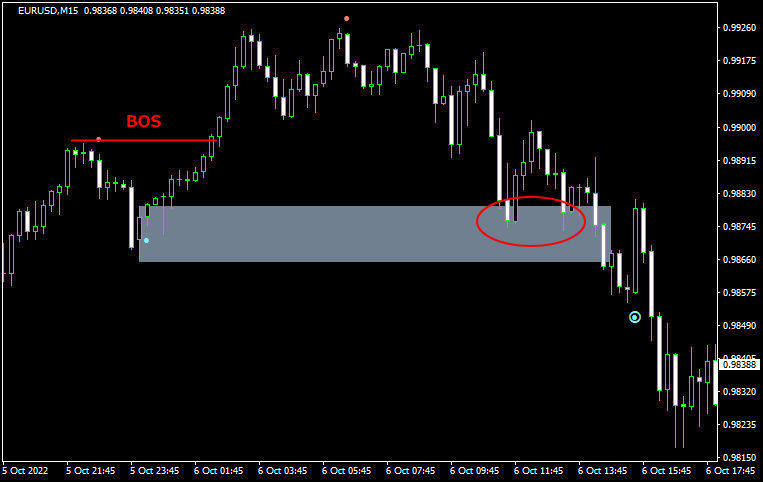 また、15分足レベルで実体がオーダーブロックを逆方向に完全にブレイクした時点でエントリーはできないと判断します。