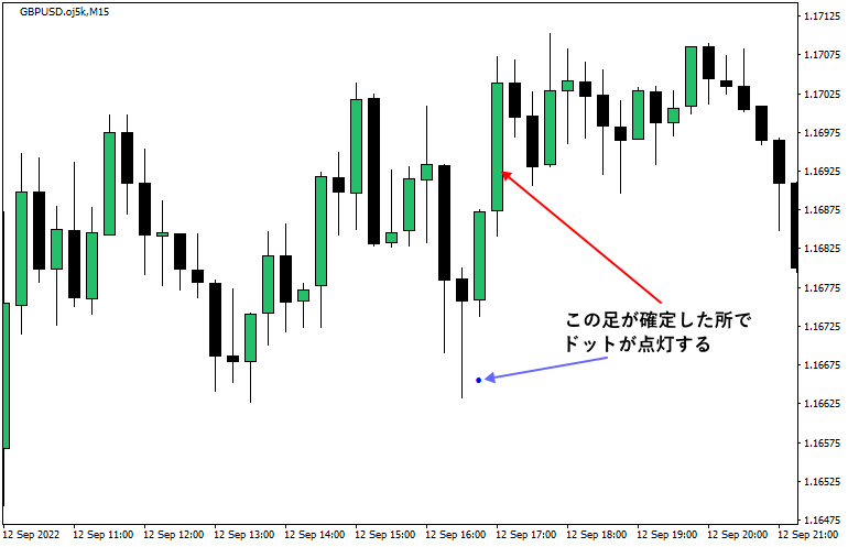 ドットの出るタイミングは、FVGが確定した時となりますので、ドットの点灯した次の足が確定した所で点灯します。