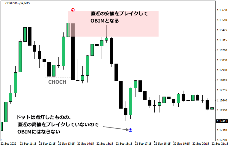ドットが点灯後に、直近の高値や安値をブレイクしないと、OBIMにはならないので要注意です。