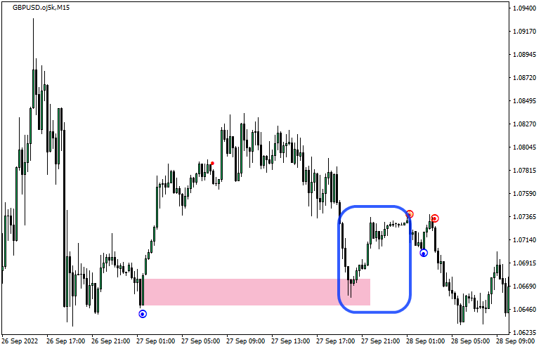 チャート左下で◎のドットが点灯後に勢いよく上昇し、オーダーブロック(ピンクのゾーン)を形成。