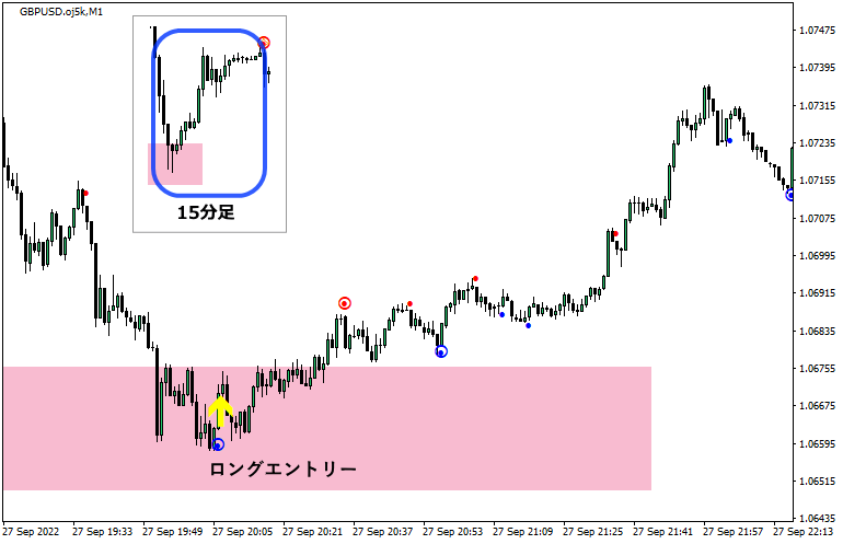 15分足のオーダーブロックまで戻して反発した所でドットが点灯しています。