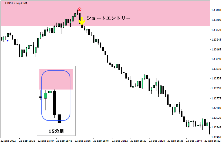 15分足の反発を1分足でピンポイントで入れるのであれば、その分だけ少ない損切り幅でトレードが出来るので、より大きなリスクリワードも期待できるのです!