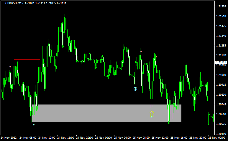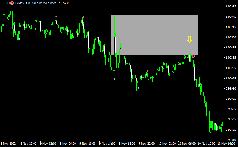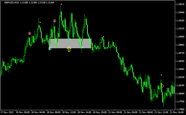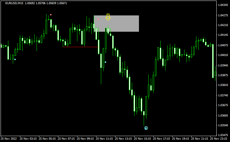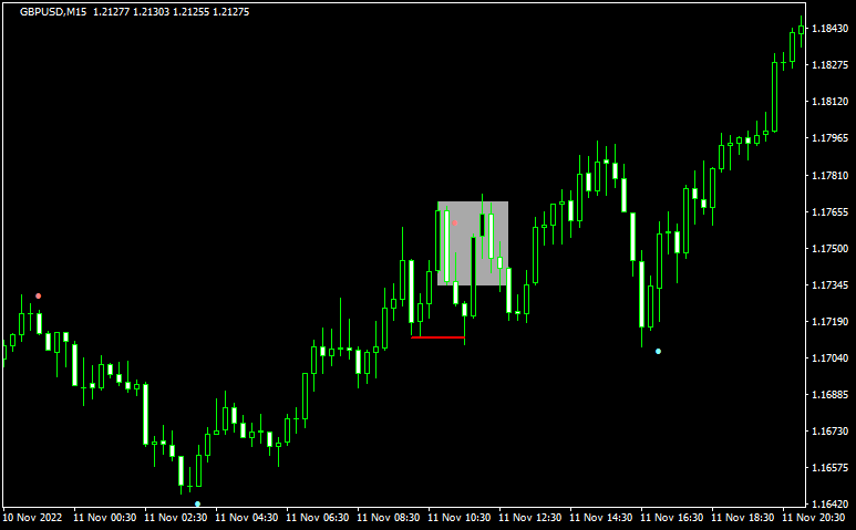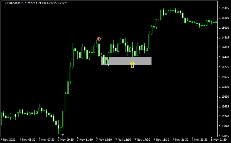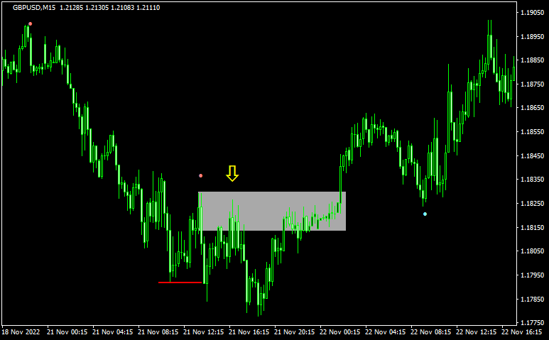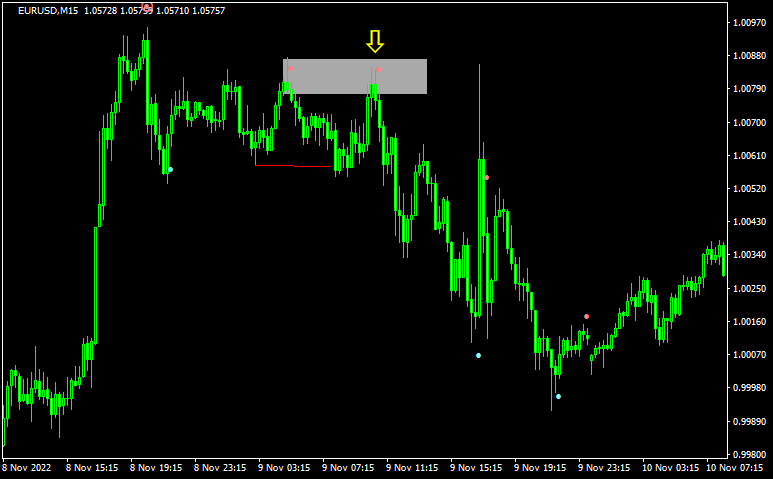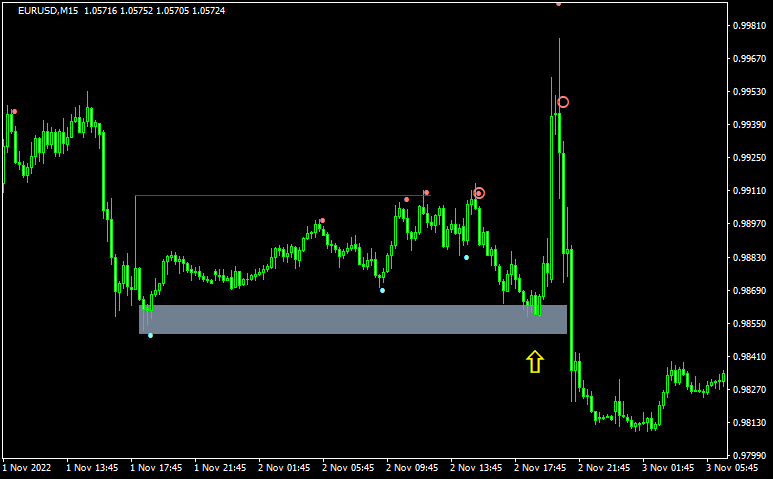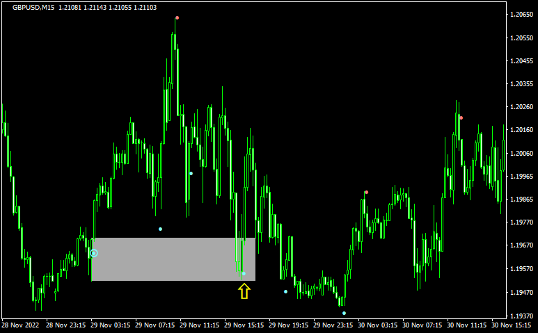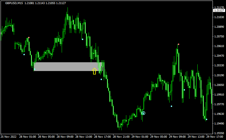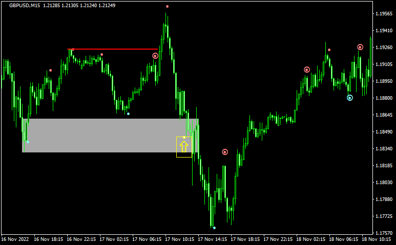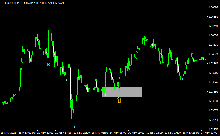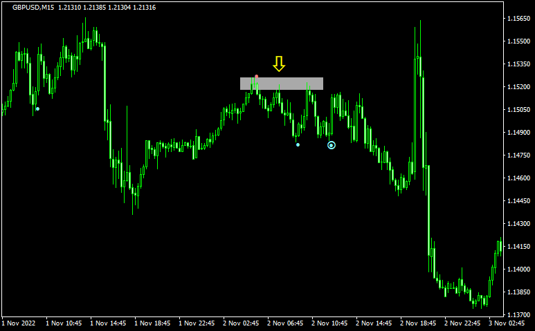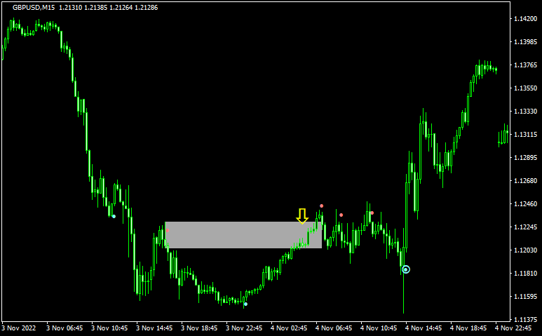 - ドット点灯後、15分足で直近の高値や安値をブレイクして、ドットの足の価格帯がオーダーブロックになる