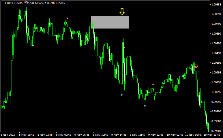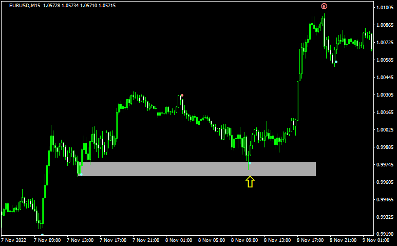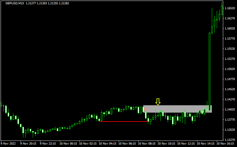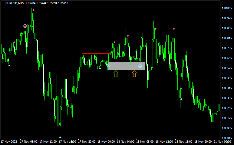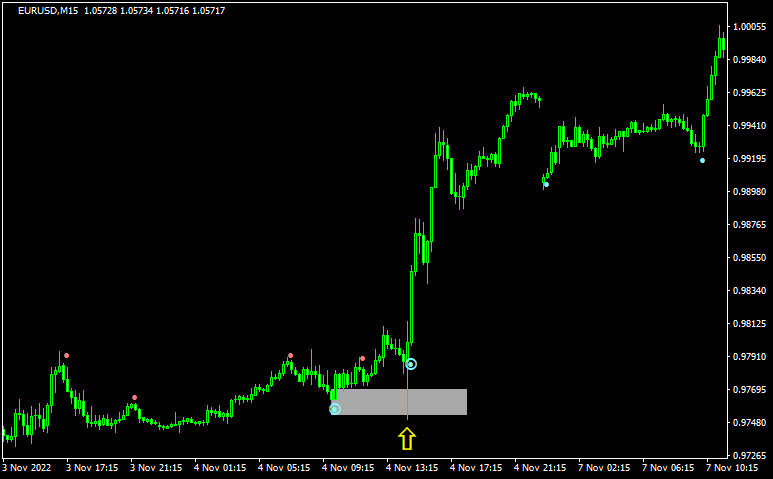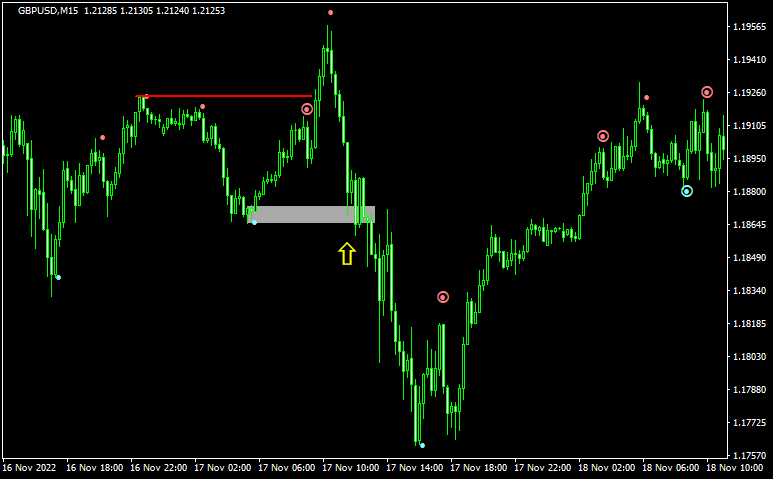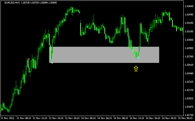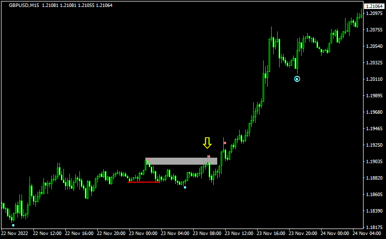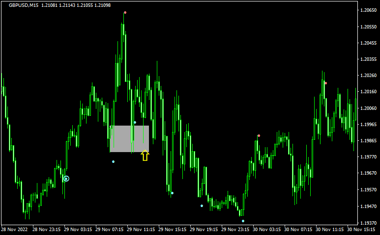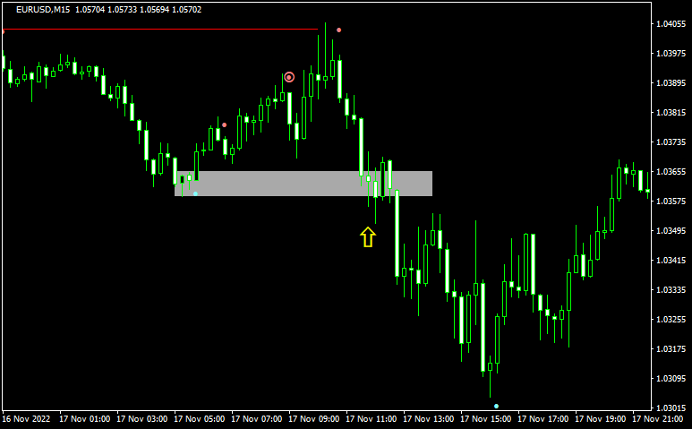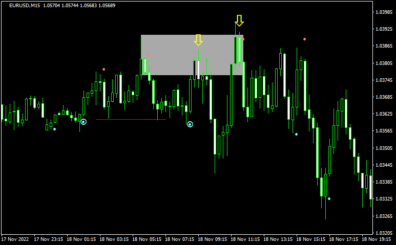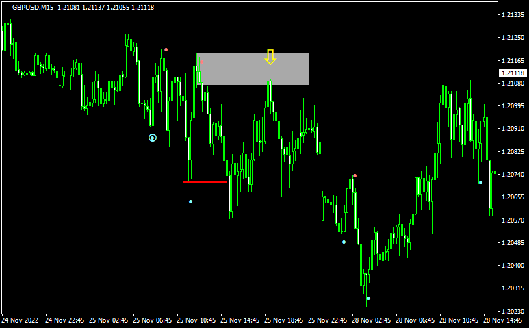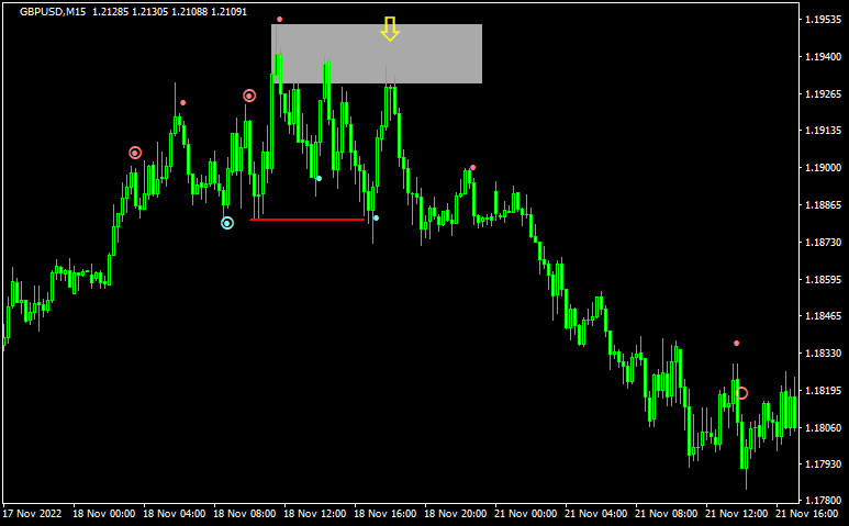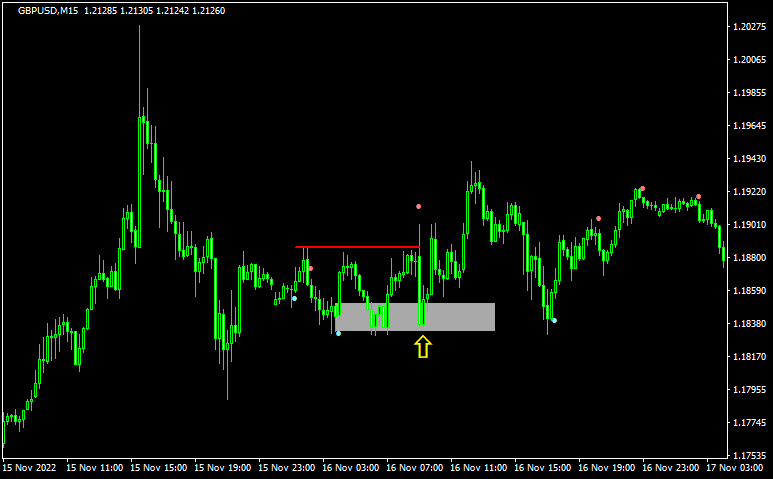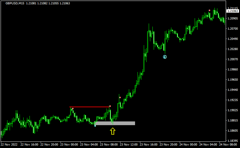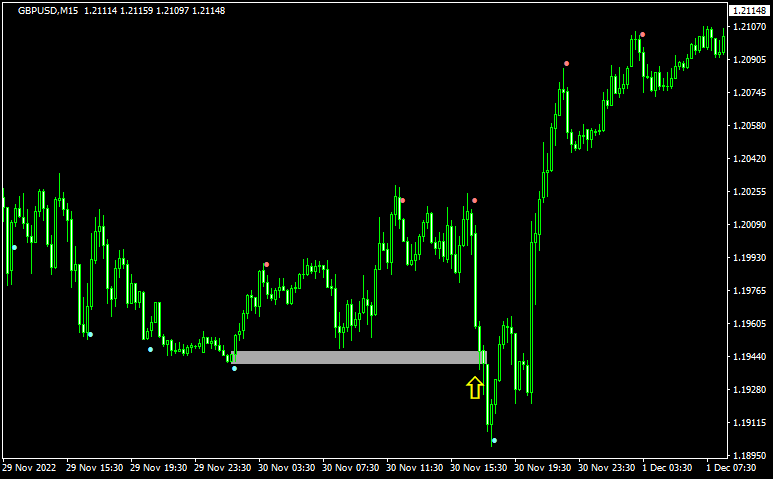 - ドット点灯後、15分足で直近の高値や安値をブレイクして、ドットの足の価格帯がオーダーブロックになる