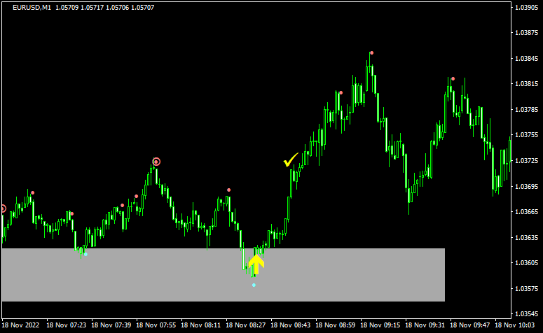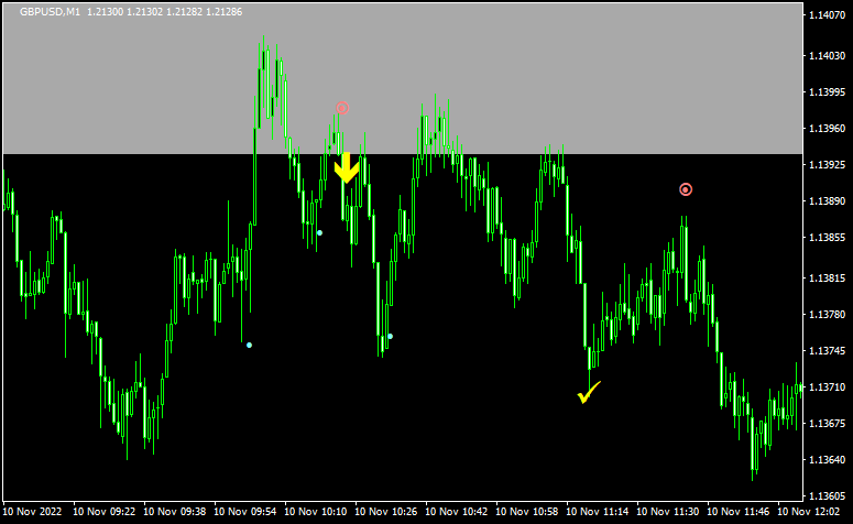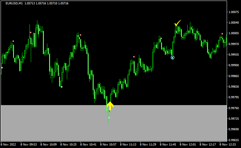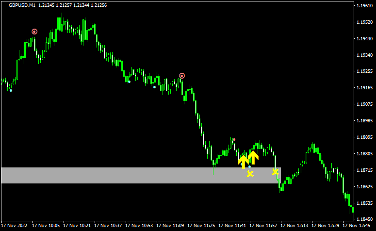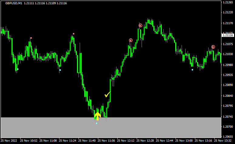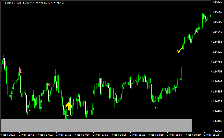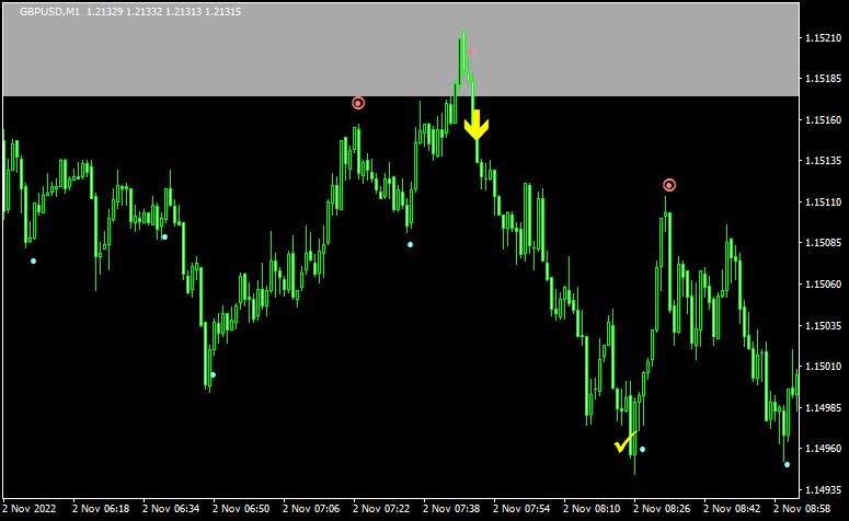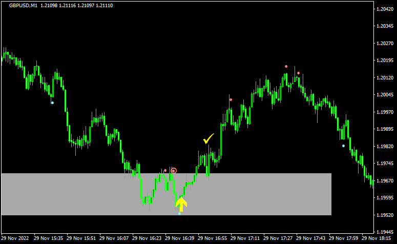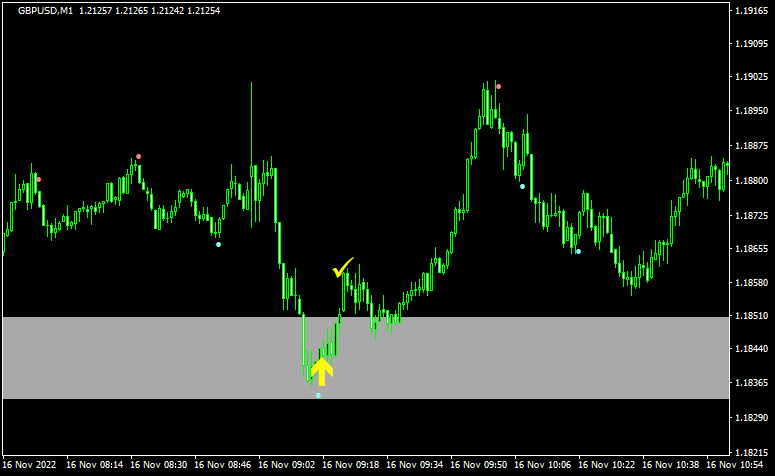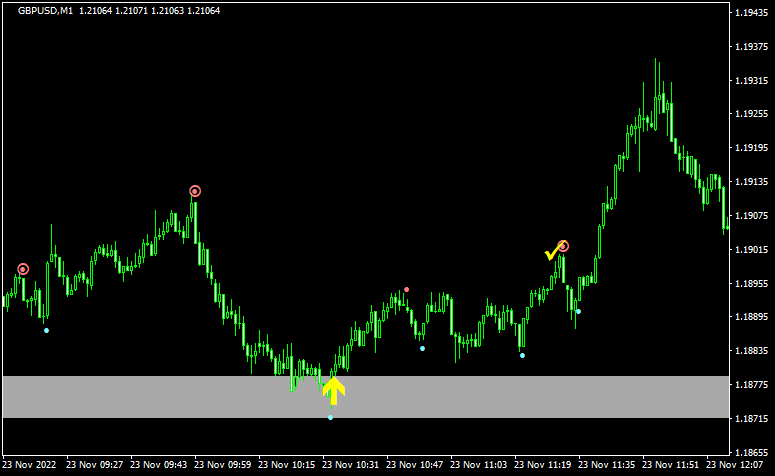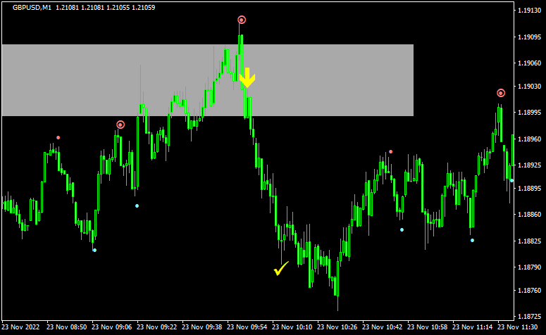 - オーダーブロックの価格帯まで戻したところで、1分足の方でドットが点灯したらエントリー