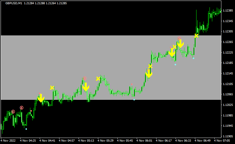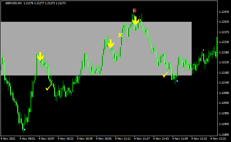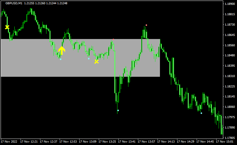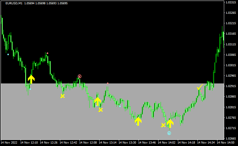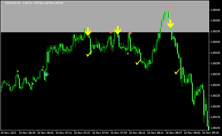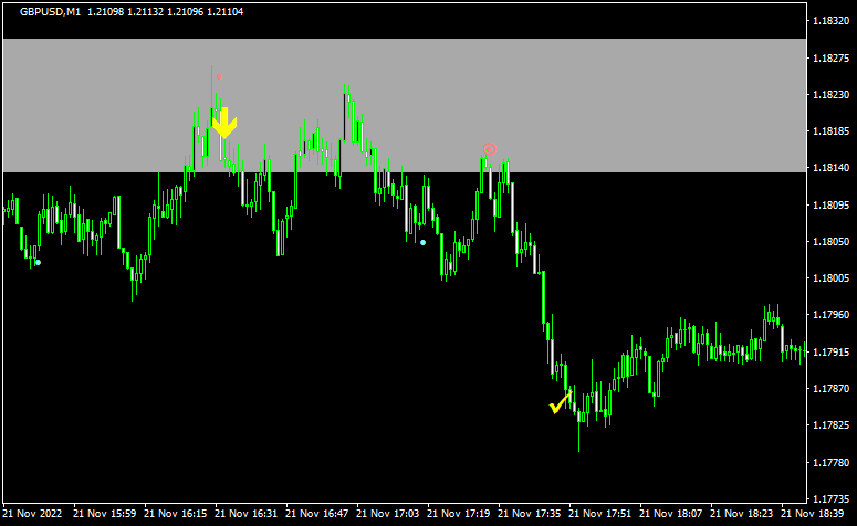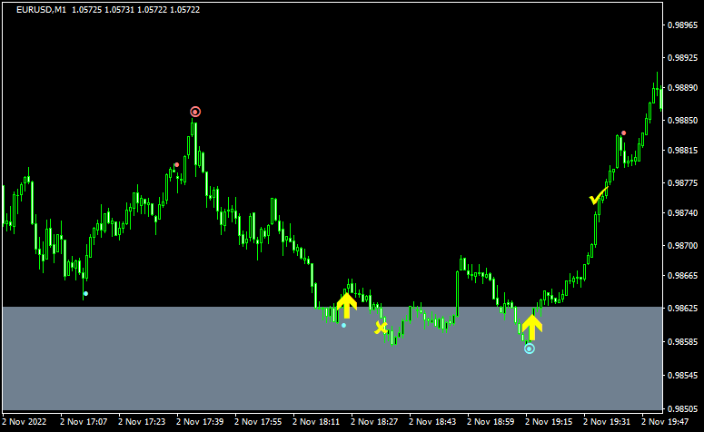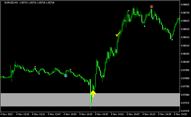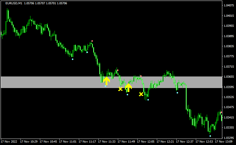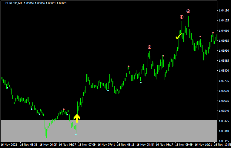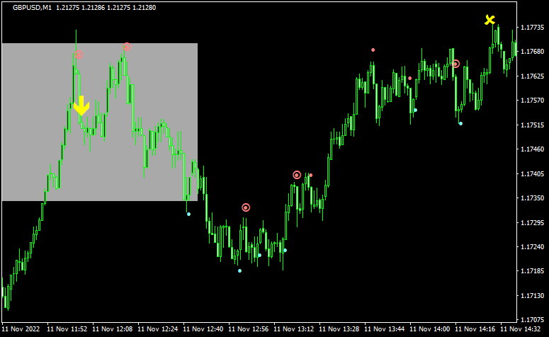 - オーダーブロックの価格帯まで戻したところで、1分足の方でドットが点灯したらエントリー