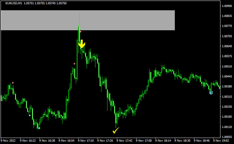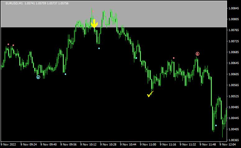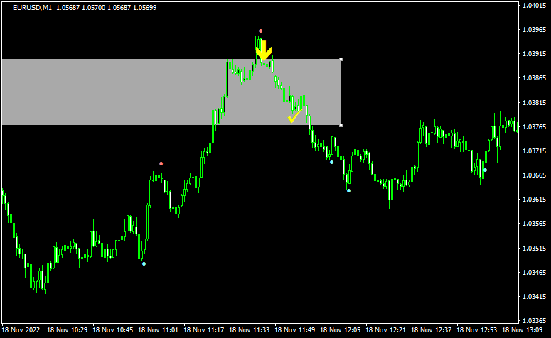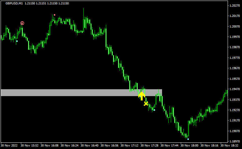 ブレイクしたらドットの点灯した価格帯がオーダーブロックになりますので、そこまで戻して来たら1分足に切り替えます。