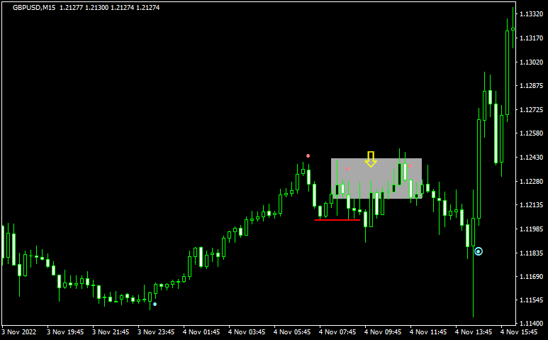 15分足でインジケーターのドットが点灯したら、直近の高値をブレイクするのを待ちます。(ブレイクしなければエントリー条件を満たしません)