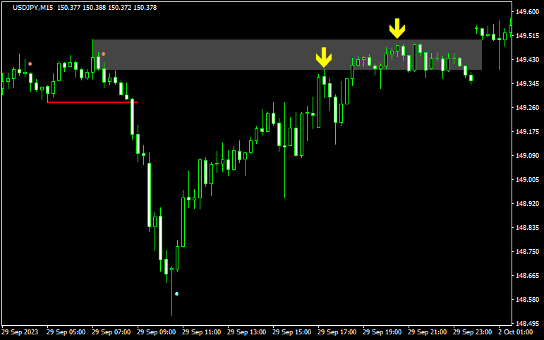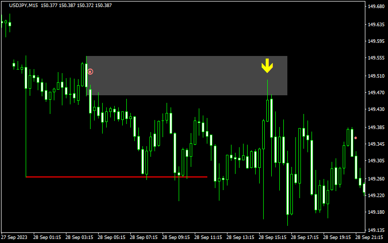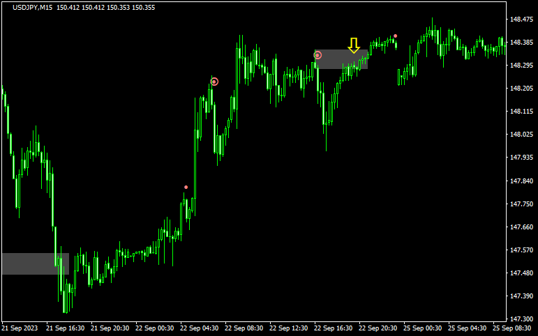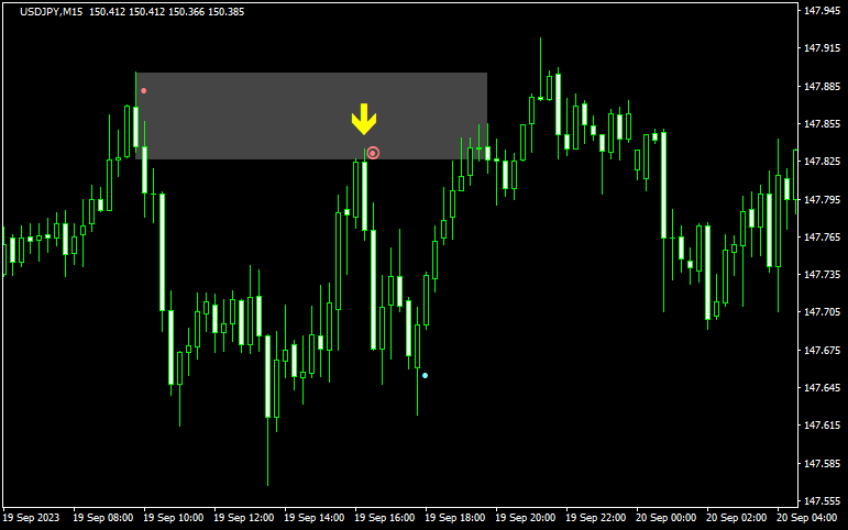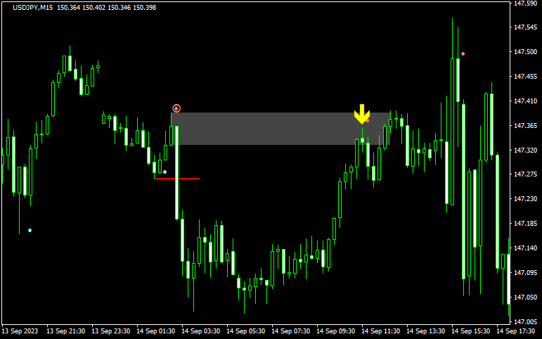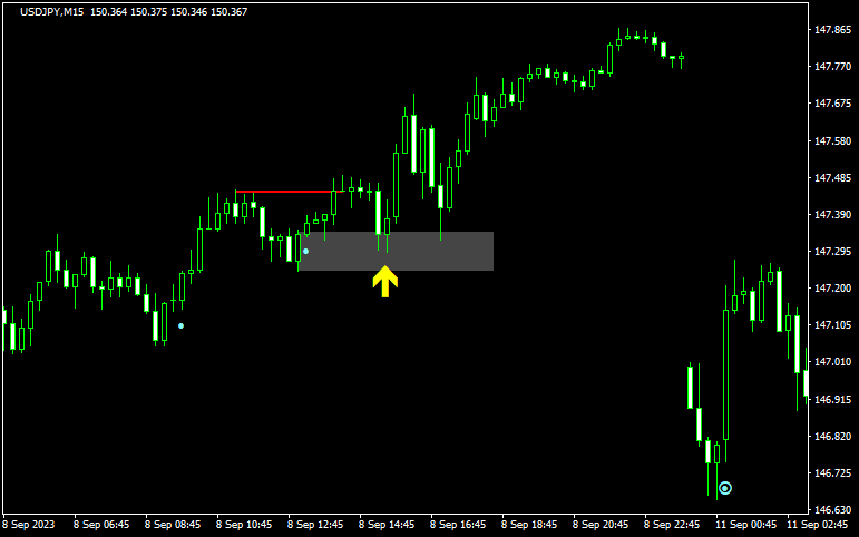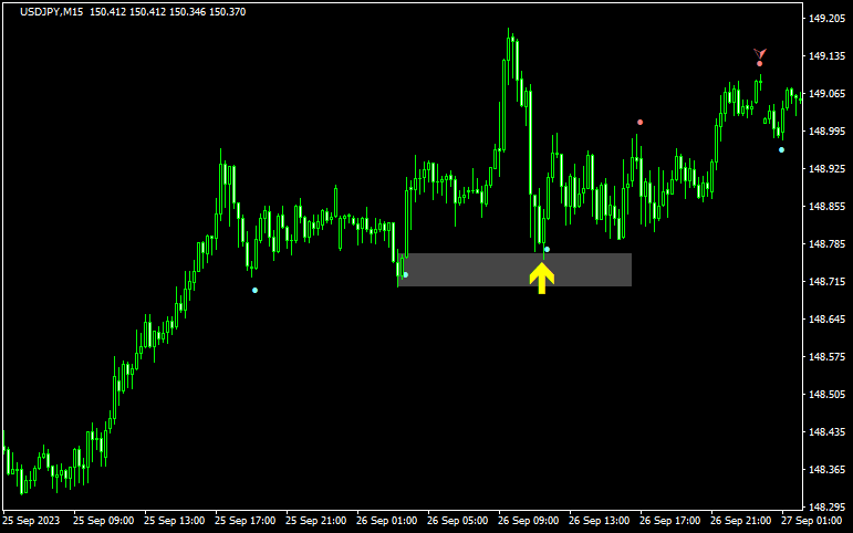 - ドット点灯後、15分足で直近の高値や安値をブレイクして、ドットの足の価格帯がオーダーブロックになる
