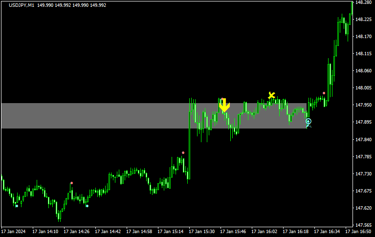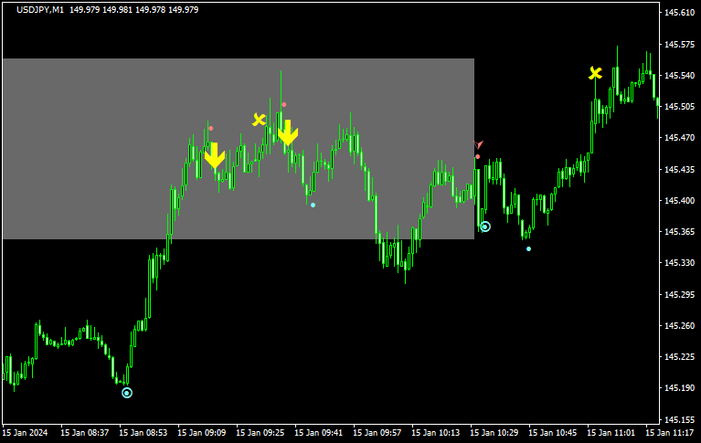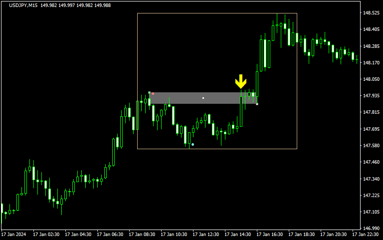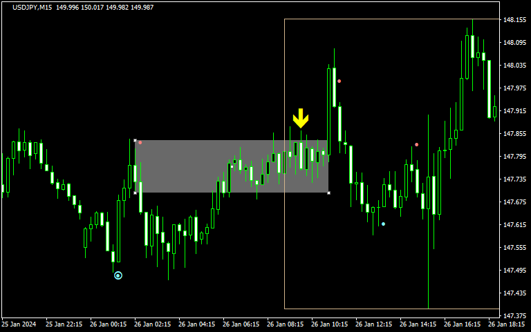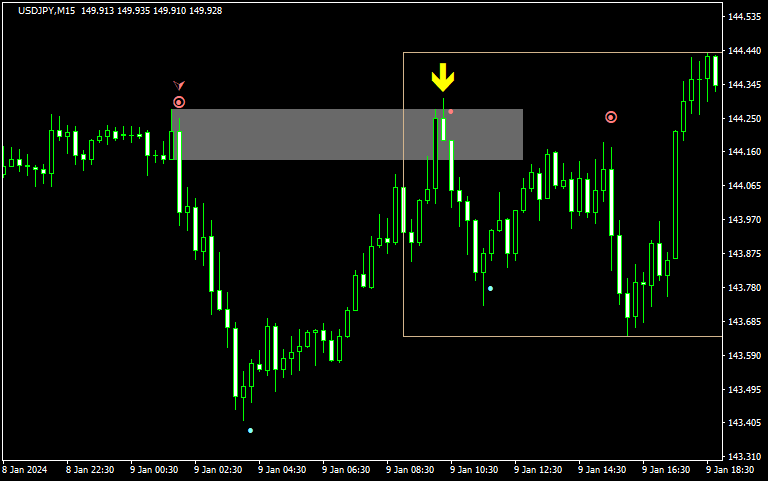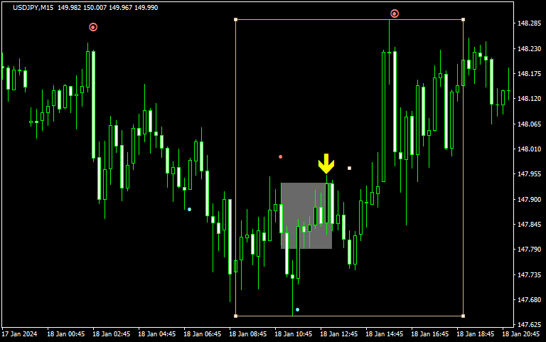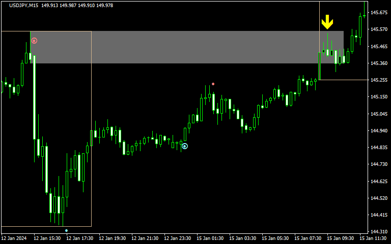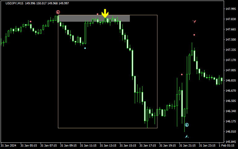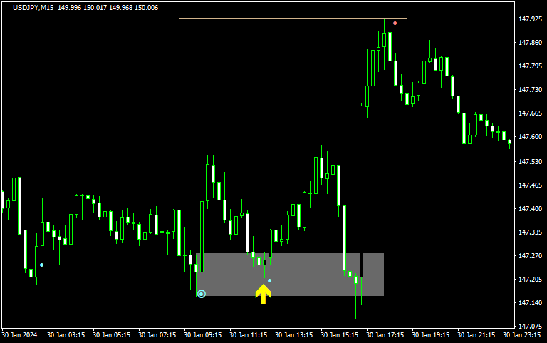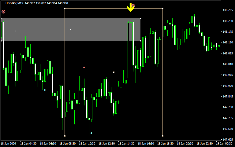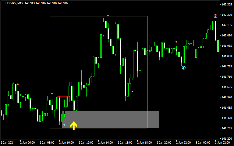 - ドット点灯後、15分足で直近の高値や安値をブレイクして、ドットの足の価格帯がオーダーブロックになる