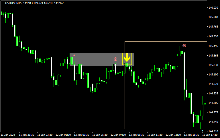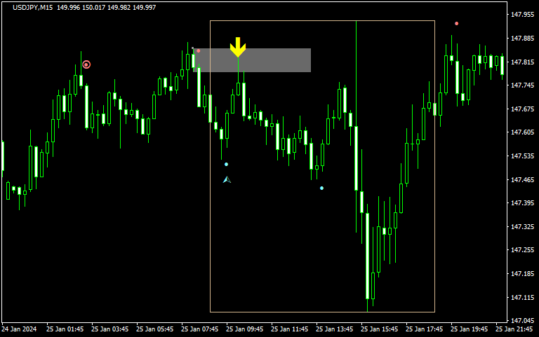 15分足でインジケーターのドットが点灯したら、直近の高値をブレイクするのを待ちます。(ブレイクしなければエントリー条件を満たしません)