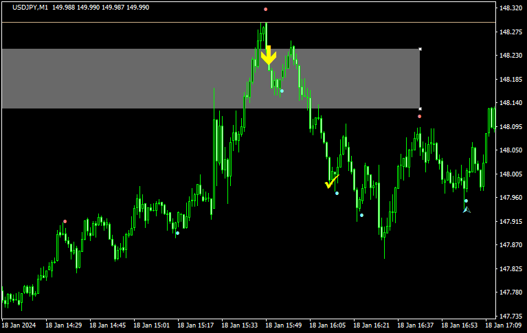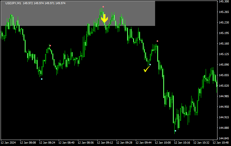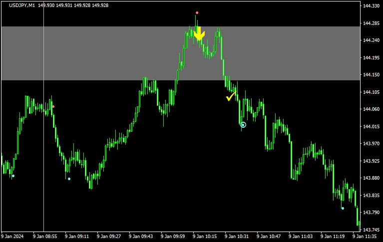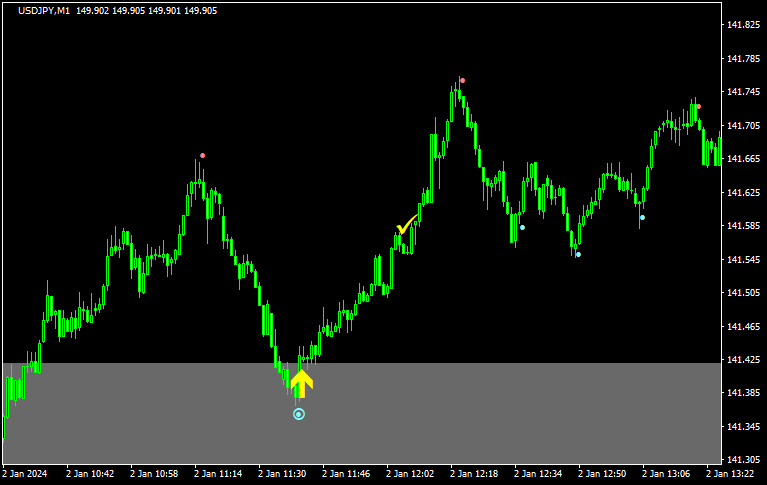 - オーダーブロックの価格帯まで戻したところで、1分足の方でドットが点灯したらエントリー