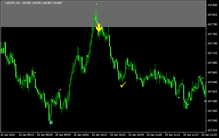 (1分足チャートの方に正確なエントリーポイントを示しています)