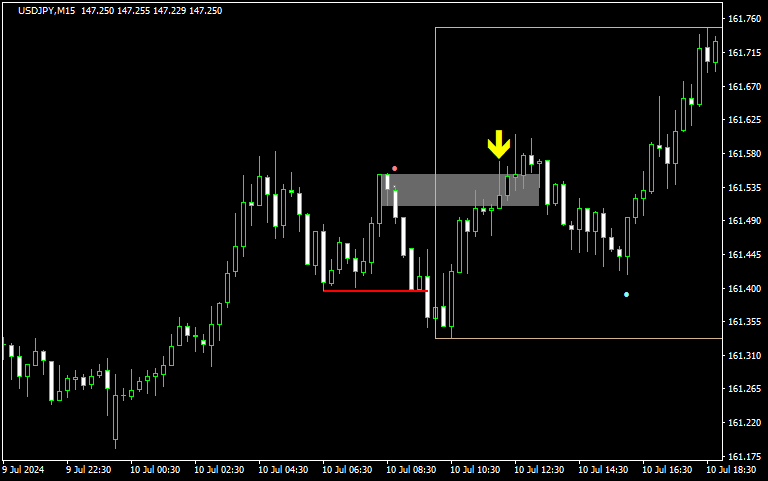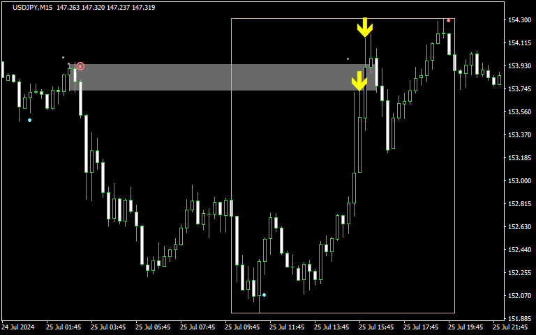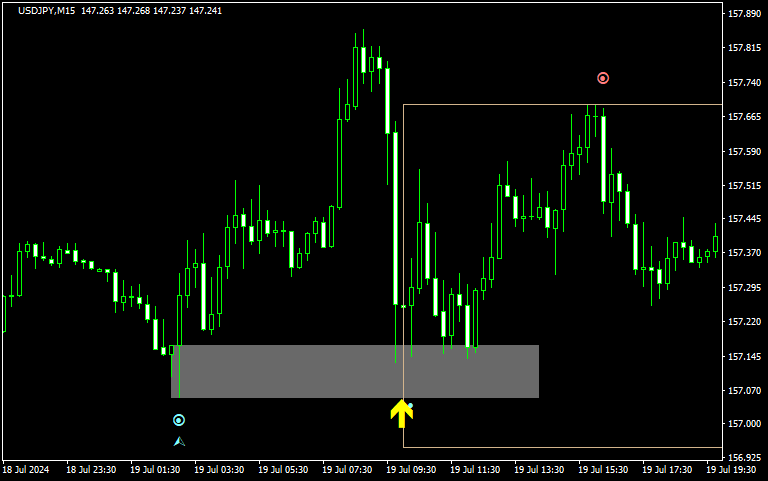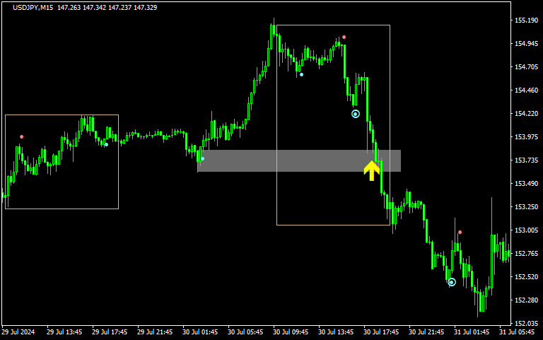 - ドット点灯後、15分足で直近の高値や安値をブレイクして、ドットの足の価格帯がオーダーブロックになる