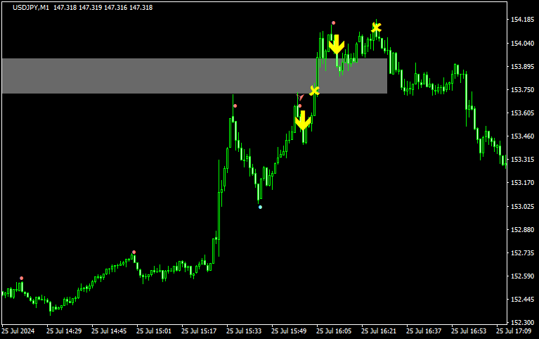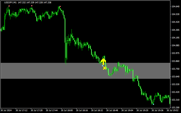 - オーダーブロックの価格帯まで戻したところで、1分足の方でドットが点灯したらエントリー