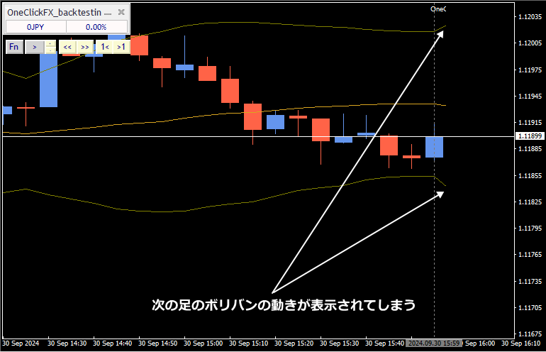 以下はボリンジャーバンドを一緒に表示したものですが、次の足が確定した時点でのバンドも一緒に表示されてしまっています。