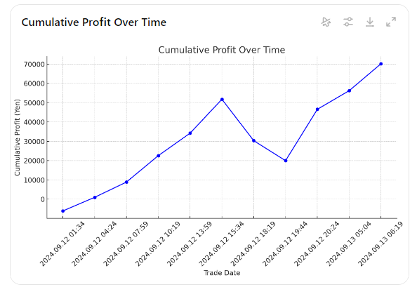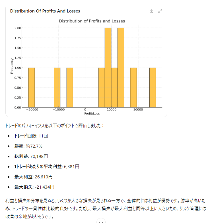 このデータをChatGPTに読み込ませることで、トレードの助言がもらえたり、統計を出すことができます。