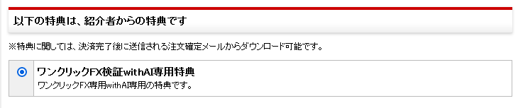 このブログからワンクリックFXwithAIをご購入される際は、購入確認画面に下の画像のように「紹介者からの特典」が表示されるか必ず確認してください。