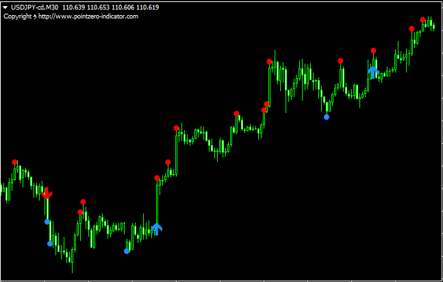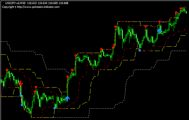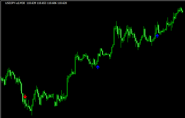 ダウ理論的にトレンド転換となると青色や赤色の矢印が出現し、更にブレイクしてくると白い矢印がエントリーサインとして出現します。