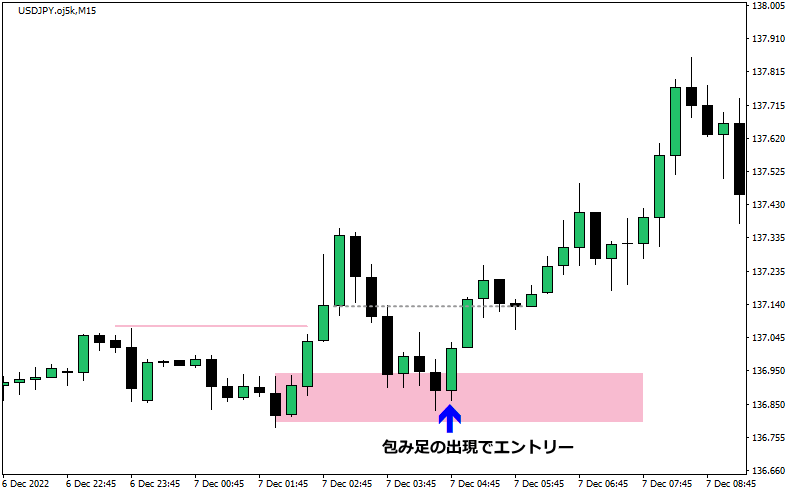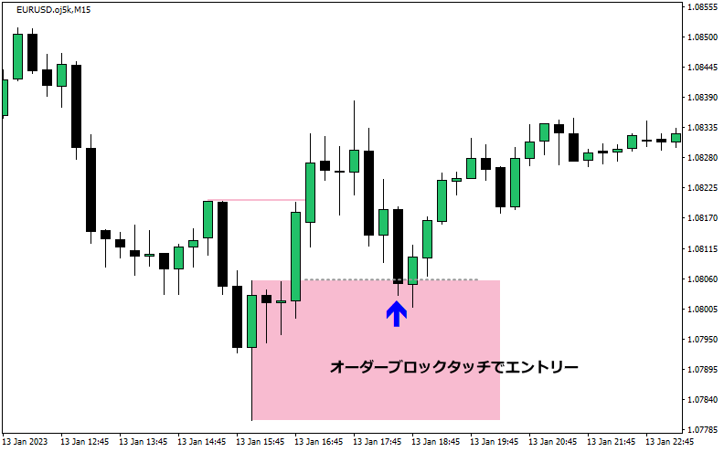 一番シンプルなのが、オーダーブロックにタッチしたらエントリーするやり方です。