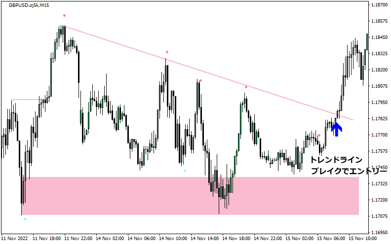 オーダーブロックまでの押しや戻りの値動きに対してトレンドラインを引いて、それをブレイクした所でエントリーするやり方です。