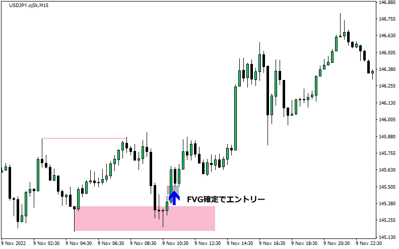 オーダーブロックでFVGを含む反発が見られたらエントリーするやり方です。