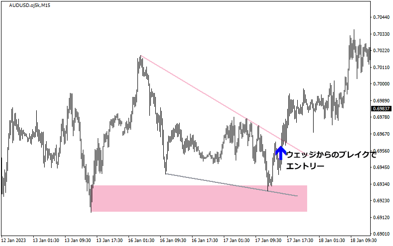 ラインと同じく、オーダーブロックまでの押しや戻りの値動きがウェッジのパターンになっていて、それをブレイクしたらエントリーするやり方です。