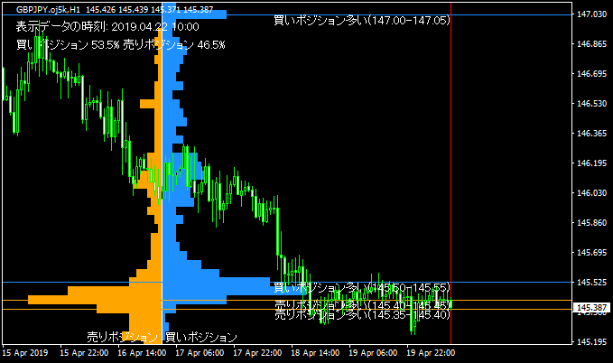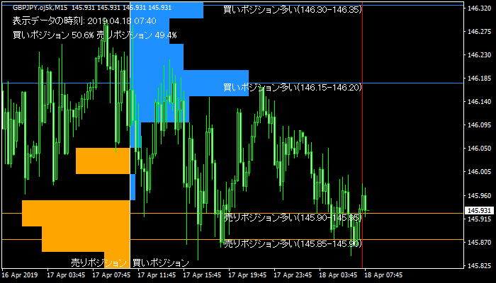 この表示にすると、現在のレート付近では売りと買いのポジションがかなり溜まっている状態であることが分かります。