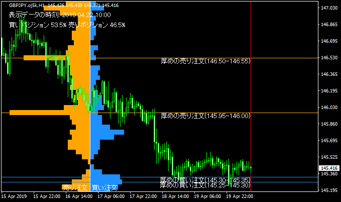 つまり、市場参加者が実際に出している注文の厚さや、ポジション保有の厚いレートなどが一目でわかってしまうのです。