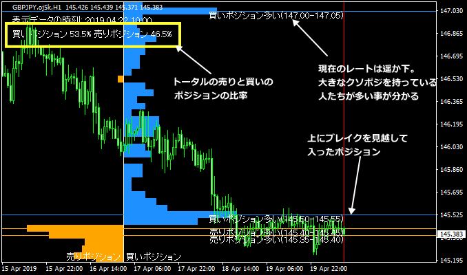 ポジション情報を見る限り、この時は現在のレートよりも上に多くの買いポジションが多くあり、含み損のクソポジを持っている人たちが多いことが分かります。