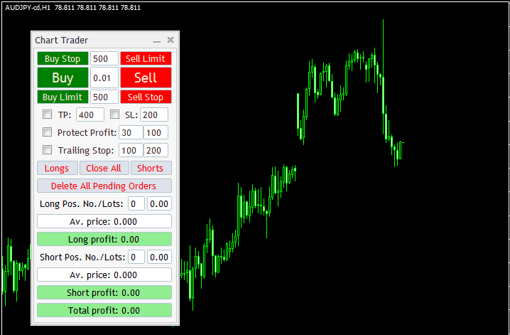 チャート上に注文パネルが表示されて、売り買いのボタンをクリックする事でエントリー&エグジットができます。