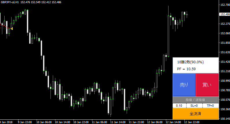 ロット調節、指値・逆指値注文といった最低限の操作に加えて、それまでの勝率やPFまでが分かりやすいイチに表示されます。